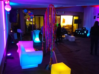 Lo importante para poder realizar un buen evento Fluor, son varios factores, Lugar completamente oscuro, usar ropa blanca y de colores fluorescentes, pintura fluor, mobiliario con telas fluorescente y decoración del mismo color, para poder resaltar lo mejor posible todo lo que se necesite. Hoy se usa un tipo de Luz UV (tipo led que es de bajo consumo y más potente) lo cual hace que tu evento se vea mas iluminado y se destaque mejor el ambiente. No olvides este consejo para que tu evento fluor sea el más entretenido. Y seas la envidia de tus invitados.